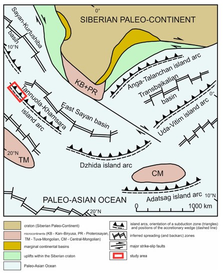 3. Gordienko, I.V.; Metelkin, D.V. The evolution of the subduction zone magmatism on the Neoproterozoic and Early Paleozoic active margins of the Paleoasian Ocean. Russ. Geol. Geophys. 2016, 57, 56–73. [Google Scholar] [CrossRef]