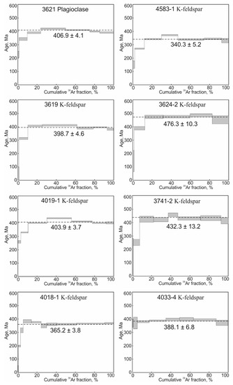 Plagioclase and K-feldspar 40Ar/39Ar analyses were performed to elucidate the post-magmatic cooling of the basic rocks. The plagioclase 40Ar/39Ar closure temperature is estimated as 225–300 °C [19], while the K-feldspar 40Ar/39Ar closure temperature is 125–185 °C for microcline and significantly higher (~315 °C) for orthoclase [20]. It is known that the grain size, its chemistry and its crystal structure will affect the closure temperature [21]. In this study, the classification of K-feldspar crystals is not always obvious, and therefore, we take the closure temperature in a wide interval between 150 and 350 °C [22].