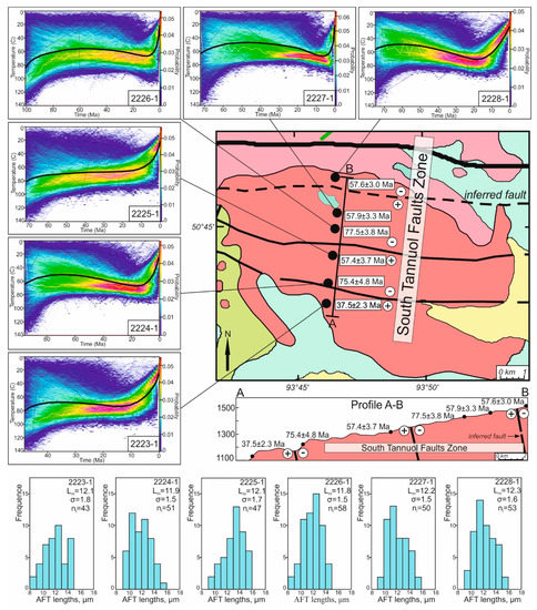 Six AFT ages were obtained for Kyzyldag massif basement samples (2223-1, 2224-1, 2225-1, 2226-1, 2227-1, 2228-1) along a profile across the STFZ. Analytical details can be found in Table 3. AFT ages are reported both as conventional zeta and central ages. Within uncertainty, these ages are the same [60,61]; therefore, only the conventional zeta ages will be reported in the following structural map and profile (Figure 8). All samples satisfy the chi-squared test (>5%). The chi-square value is used to test the dispersion of single grain ages. In this case, all the grains in each sample can be grouped in one age population. Four samples (2223-1, 2225-1, 2227-1, 2228-1) exhibit early–middle Paleogene (~60–40 Ma) AFT ages, whereas two samples (2224-1, 2226-1) have Late Cretaceous AFT ages (~80 and 75 Ma). Generally, the obtained AFT ages are younger than in other areas of Altay–Sayan region [26,27,28,62,63,64,65]. It can be dealt with the analyzed samples are clearly located in major fault systems [62,63] such as the STFZ.