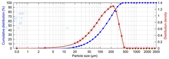 The cumulative distribution and distribution density with respect to grain size of the microspheres is presented in Figure 3. According to the results of the analysis of granulometric composition (Figure 3), the size of the particle distribution of microspheres changes in the range from 0.5 to 500 μm. The percentage of grains of microspheres with a diameter below 250 µm or a diameter range of 250 to 500 µm are 81.4% and 17.4%, respectively. For grain diameters larger than 500 µm, their content in the whole volume is equal to 0.2%. The particle size of the microspheres for D10, D50, and D90 is equal to 170.6 µm, 270.4 µm, and 430.7 µm, respectively. The value of dv10, dv50 and dv90 represents the size below which 10%, 50%, and 90%, respectively, of sample falls. The average diameter of the microspheres used in the studies was 300.2 µm.
