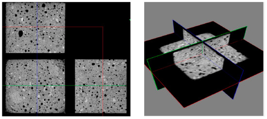 General view of the cross-sections of the sample in three planes, using X-ray technology (air pores marked by black dots).