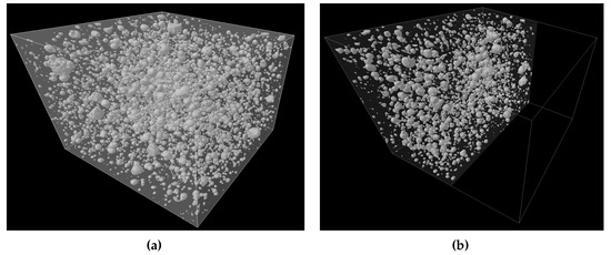The three-dimensional model of a concrete specimen with microspheres is presented in Figure 4. The black shadow represents air voids entrained in concrete samples. The distribution of the grains of microspheres (5% and 10%) in the concrete specimen by the three-dimensional (3D) method is shown in Figure 5 and Figure 6.