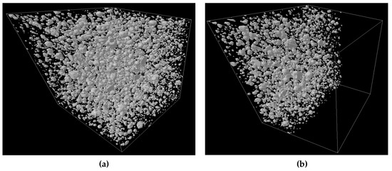 The structure of air pores in the hardened concrete with the participation of microspheres was determined using computed tomography (X-ray). In the first step, the concrete samples were prepared. The specimens with dimensions of 40 mm (height), 40 mm (width), and 40 mm (depth) were cut out from concrete cubes with dimensions of 100 × 100 × 100 mm (using a diamond saw) in order to obtain three-dimensional (3D) images. With a focus on improving the image quality, as compared to two-dimensional (2D) images, the X-ray source voltage of the micro-CT scanner was set to 130 keV, the current was 61 μA, and the exposure time was equal to 5000 ms. Additionally, despeckling and bitwise operations were carried out. The pixel size was 120.7 μm. The X-ray projections were recorded with a rotation increment of 0.2° within 360° for about 18 h. The scans were averaged based on six scans. The image reconstruction was carried out with the NRECON software (Version, Bruker microCT, Kontich, Belgium). In order to separate different concrete phases, the global thresholding of the grey level was used, based on the differences in the absorption of the X-ray radiation by the phases (e.g., 0–54 for air voids, 54–123 for the cement matrix, and 123–255 for aggregate). The luminance curve, colour transfer function, and cutting/clipping box were manually adjusted to obtain 3D images of good quality. For improving visualisation, light and shadow options were introduced [25].