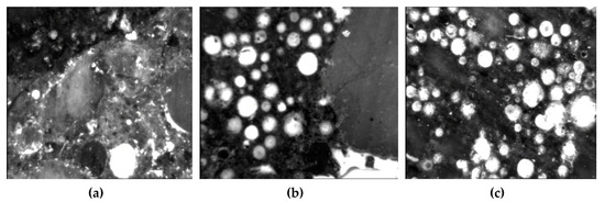 Air void distribution (white color) at the cross-section of concrete specimens after 28 days (w/b = 0.50): (a) 0% microspheres, (b) 5% microspheres, and (c) 10% microspheres.