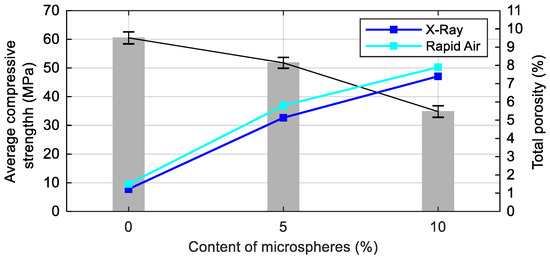Figure 8 presents a comparison between the total porosity of the considered concrete samples for the two mentioned methods (X-ray and Rapid Air). The results achieved from the automatic image analysis system are higher, especially for the concrete with microspheres. The studies proved that the increase of microspheres in concrete significantly reduced its compressive strength.