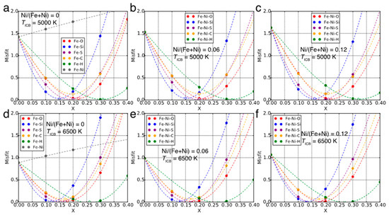 The misfit from the value of the preliminary reference earth model (PREM) as a function of atomic fraction of LEs (XLE). Three different Ni fractions, 0 (a,d), 0.06 (b,e), and 0.12 (c,f) and two different TICB of 5000 K (a–c) and 6500 K (d–f) are examined. Filled circles are the results of molecular dynamics (MD) and dashed lines are the cubic spline interpolations. The atomic fractions at the minima correspond to the best-fit LE concentrations. Open circles indicate the misfits obtained from MD with the best-fit compositions, which are in good agreement with the minima of spline interpolations. Errors in the misfits originated in the fitting procedures are comparable to the size of symbols.