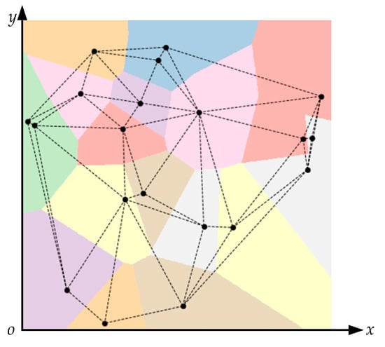 Determining the region of samples means determining the region of the point cloud according to a specific confidence coefficient. For this purpose, Delaunay triangulation [23,24] is adopted. Delaunay triangulation is defined as a series of touching triangles that do not overlap with each other, and the region of the circumcircle of each triangle does not cover other triangles’ ices. Figure 2 shows an example of Delaunay triangulation. In this figure, all the points are interconnected by several dashed lines and then formed into a triangulation network. According to the Delaunay triangulation method, the connection mode of the points is unique, and a Delaunay triangulation always corresponds to a unique Voronoi polygon network [24], as shown in Figure 2.