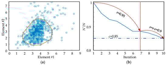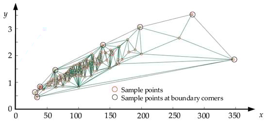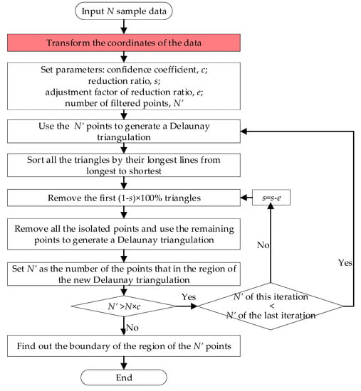 It should be noted that the reduction ratio, s, should be close to 1. Therefore, when the algorithm meets the inequality N’ ≤ N × c, it can be considered that N’ = N × c and the boundary of the current Delaunay triangulation can be regarded as the boundary of the points under the confidence coefficient, c. The boundary is the connection of some specific sample points. In addition, when the N’ in an iteration equals the N’ in the last iteration, it means that s is too large to be used to filter the points. In this case, the adjustment factor of reduction ratio, e, is applied to reduce the value of s.
