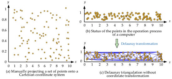 Distributions of sample points when the length of the x-axis and the length of the y-axis are not of the same order of magnitude. (a) Manually projecting a set of points onto a Cartesian coordinate system; (b) Status of the points in the operation process of a computer; (c) Delaunay triangulation without coordinate transformation.
