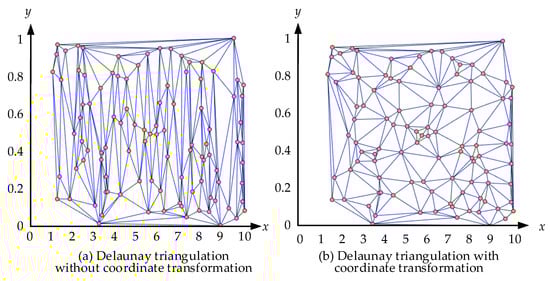 where, ymax and ymin are the maximum and minimum of the points along the y-axis and xmax and xmin are the maximum and minimum of the points along the x-axis. (xi, yi) is the original value of the ith point, and (xi’, yi’) is the zoomed valued of the ith point. By generating a Delaunay triangulation with the zoomed points, a set of connection rules for the points can be calculated. After this step, by connecting the original points according to these connection rules, a new triangulation can be made, as shown in Figure 5b. It is evident that Figure 5b is more consistent with the visual observation.