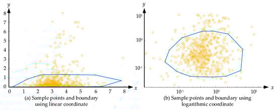 Generating boundaries of sample points with a linear coordinate and a logarithmic coordinate (the confidence coefficient is 0.85). (a) Sample points and boundary using linear coordinate; (b) Sample points and boundary using logarithmic coordinate.