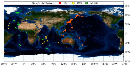 The samples used in our experiment were 3803 gabbroic rock samples downloaded from PetDB [29] and GEOROC [30] databases. All the samples were divided into three types: island-arc gabbroic rocks (IAG), ocean-island gabbroic rocks (OIG), and mid-oceanic ridge gabbroic rocks (MORG). The distribution of the samples is illustrated in Figure 9. The numbers of IAG, OIG, and MORG were 743, 1668, and 837, respectively. Every sample contained data for 143 elements, including major elements, trace elements, and isotopes. The original data were filtered as follows.