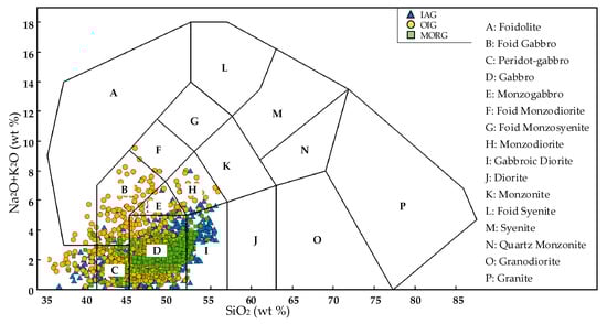 First, all the data were transformed into the GEOROC format. Then, according to the names of the rock samples, the volcanic rocks, mantle xenoliths, dunite, dolerite, pyroxenite, sedimentary rocks, and metamorphic rocks were removed to ensure that remaining samples were gabbroic rocks, such as gabbro, anorthosite, norite, essexite, and troctolite. After this step, the samples with SiO2 > 56 wt% or SiO2 < 35 wt% were filtered out. Moreover, because the tectonic setting information for the samples was ambiguous (some samples were labeled with geomorphologic terms, for instance, seamount, submarine ridge, and convergent margin), we carefully checked all the samples according to the locations, longitudes and latitudes, and the analytical results provided by the contributors, and then divided them into the correct tectonic settings. In addition, it should be noted that we did not remove the cumulate gabbroic rocks, altered samples, or contaminated samples. Further, considering that there might be some uncertain influencing factors in the data set (for example, erroneous records), the box-plot approach was used to remove the outliers and ensure that the remainder of the samples accounted for 85% of the whole data set. Figure 10 shows the distributions of the remaining samples on the plutonic Total alkali–silica (TAS) diagram.