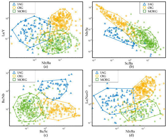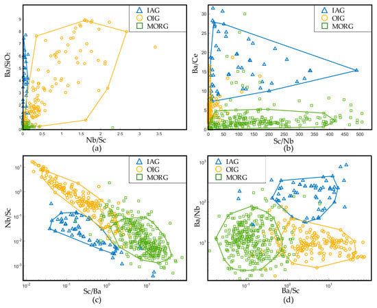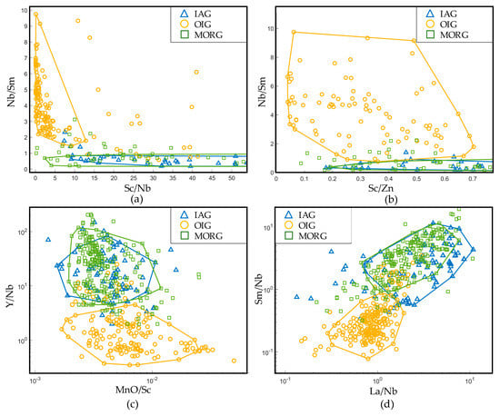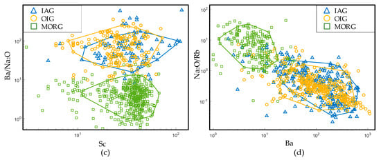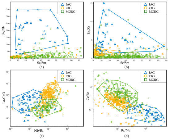 In previous studies, Sc has seldom been used for discrimination. Sc a rare earth element. It is a high field strength element and is similar to V, Ti, and Cr in characters. Due to the high distribution coefficient of Sc in pyroxene (Kd (cpx-basalt melt) = 1.31 [69]), in the fractional crystallization of magmas, Sc mainly enters pyroxene and is rarely present in olivine. In MORG, Sc is enriched (the mean is 30.6 × 10−6, Table 1), while in IAG and OIG, the contents of Sc are low (10–12 × 10−6, Table 1). This contrast might occur because gabbroic rocks are mainly composed of cumulates (mean Mg# = 0.75), so Sc enters the lattice of pyroxene and is removed by fractionation in island arc and ocean island systems. Ba is an incompatible element; the contents of Ba in IAG and OIG are high (Table 1), and that of MORG is extremely low (the contents of Ba in IAG, OIG, and MORG are 98 × 10−6, 140 × 10−6, and 7.7 × 10−6, respectively, Table 1). Therefore, in Figure 23b, the value of Sc/Ba in MORG is the highest (the mean is 4.0), while in IAG and OIG the values are 0.11 and 0.09, respectively. It follows that Sc/Ba can discriminate between MORG and non-MORG effectively, as shown in Figure 24b. Moreover, because of the depletion in Nb in IAG and the enrichment in Nb in OIG and the similar contents of Sc in IAG and OIG, Nb/Sc can easily distinguish IAG and OIG.
