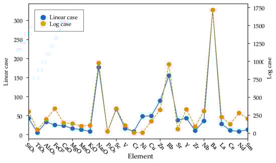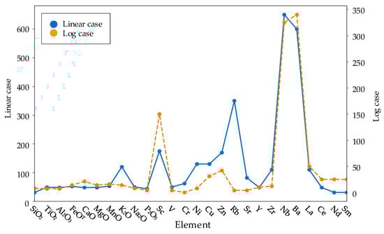In addition, Figure 19 indicates that Ba, Na2O, Rb, Zn, and Sc contribute the most to linear discrimination, and that Ba, Na2O, and Rb are the most effective elements in logarithmic discrimination.
