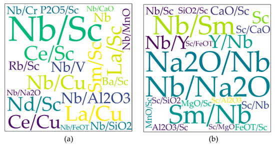 The word clouds of high-frequency elements (including element ratios) are illustrated in Figure 15. This figure indicates that Nb/Sc has a significant effect on discriminating between OIG and non-OIG for linear cases, and the element ratios comprised of Na2O and Nb, Nb and Sm, Nb and Y are the most important elements (and element ratios) for logarithmic cases.