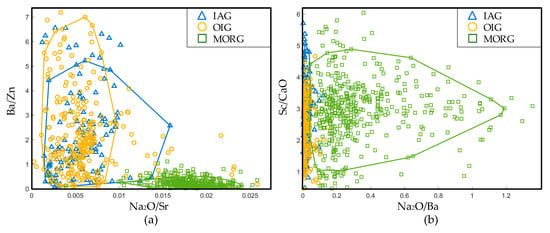 Na is a large ion lithophile element (LILE) and is mainly present in plagioclase. Due to fractional crystallization, the contents of Na2O in cumulate rocks are generally low. The contents of Na2O in IAG, OIG, and MORG are also found to be similar. Therefore, the differences between La/Na2O values of IAG, OIG, and MORG are mainly dependent on the values of La. In Figure 24d, La/Na2O is mainly used to distinguish between OIG and MORG. OIG is rich in La, while MORG is poor in La. Consequently, La/Na2O can discriminate between the two tectonic settings. IAG is extremely low in Nb and rich in Ba; thus, the Nb/Ba value of IAG is significantly higher than the Nb/Ba value of OIG and MORG. As a result, the La/Na2O–Nb/Ba diagram also has good performance in discriminating among IAG, OIG, and MORG.