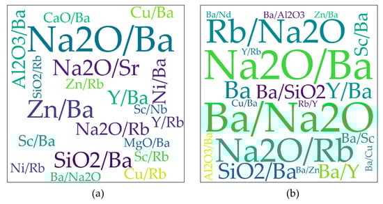 The word cloud of the linear discrimination diagrams shows that Na2O/Ba has the most significant effect on the discrimination process, as shown in Figure 18a; the word cloud of the logarithmic discrimination diagrams indicates that the element ratio pairs comprised by Na2O and Ba, Na2O and Rb are the most frequently occurring elements, as shown in Figure 18b.