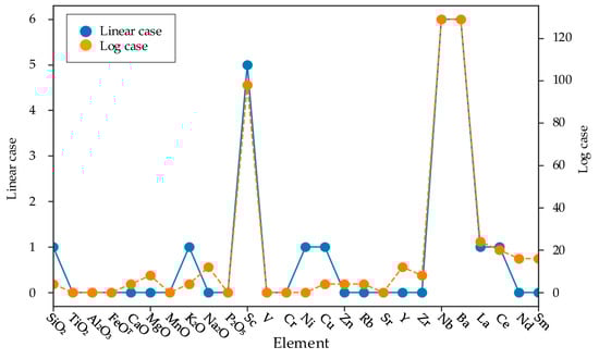For further analysis, we counted the frequencies of occurrence of the basic elements by decomposing all the element ratios, as shown in Figure 13. The result illustrates that Nb, Ba, Rb, La, and Sc have the highest frequencies in linear cases, meaning that these five elements contribute the most to the linear discrimination process; Ba, Nb, Sc, La, and Zn have the highest frequencies of occurrence in logarithmic cases, meaning that they are the most useful elements for logarithmic discrimination.