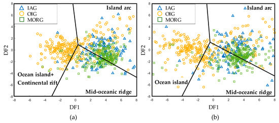 Recently, Verma et al. [59], Agrawal et al. [60], and Verma and Agrawal [61] studied the tectonic settings of basic and ultrabasic rocks (eruptive rocks and intrusive rocks) collected from the global rock database and proposed 15 new multidimensional discrimination diagrams for a wide range of ultrabasic to basic magmas to infer their tectonic settings from linear discrimination analysis. These diagrams involve coherent statistical treatment of compositional data consisting of log-ratio transformation as a fundamental requirement for such data handling [62,63,64,65,66,67] and have achieved positive results. Figure 23 shows the results of projecting our samples onto the two diagrams proposed by Verma and Agrawal [61]. The only common critical element between the two diagrams and our analysis is Nb. It can be seen that these diagrams can barely distinguish IAG and MORG.