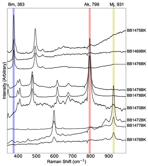 Raman spectroscopy was used to identify the recovered samples. Bm was identified by the strong modes at 383 and 501 cm−1 (Figure 1), and a weaker mode at 542 cm−1 also appeared clearly in spectra. Ak was identified by the strong modes at 480 and 799 cm−1 along with a few other weaker modes. Mj was identified by the strong modes at 602 and 931 cm−1. The peak positions for all three phases are in good agreement with those reported in the literature [,,,].