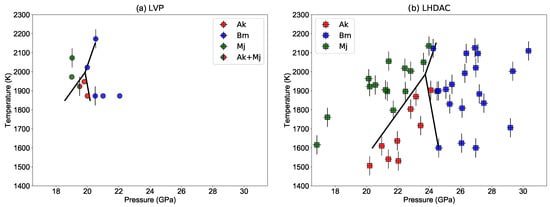 Data points from our (a) LVP and (b) LHDAC experiments: The red, green, and blue symbols represent Ak, Mj, and Bm, respectively. The estimated phase boundaries and triple point are shown. We fixed the Clapeyron slopes of the involved phase boundaries to those reported in Ishii et al. [] and then adjusted the location of the phase boundaries to fit our data points. Our LVP triple point is located at 2000 ± 50 K and 19.9 ± 0.4 GPa. Our LHDAC triple point is located at 1990 ± 100 K and 23.8 ± 0.6 GPa.