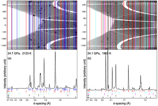 The 2D diffraction images were acquired using a Dectris Pilatus detector at GSECARS 13-IDD and then integrated into 1D diffraction patterns using calibration parameters obtained from the LaB6 standard in DIOPTAS software []. Diffraction images were exposed for 5–10 s and were collected before, during, and after heating. The diffraction images were analyzed, and phases were identified using PeakPo software []. Pt peaks were fitted with pseudo-Voigt profile function to obtain the peak positions in PeakPo. Pressure was calculated with pytheos []. The unit-cell volume of Pt was calculated with the 111 and 200 peaks and some with the 220 peak as well.