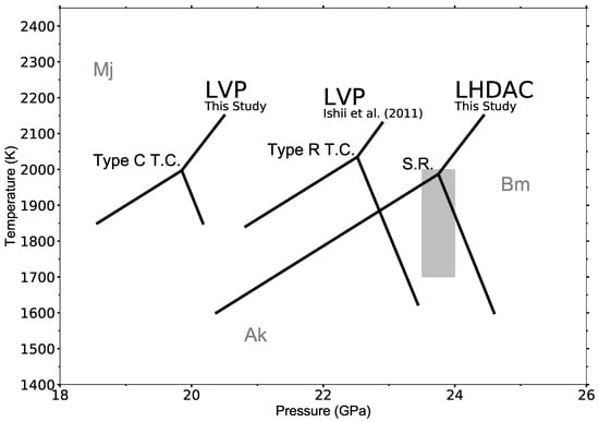 Some former LVP studies have measured the Ak–Mj, Mj–Bm, and Ak–Bm boundaries in pure MgSiO3 and inferred the triple point [,,]. However, the reported conditions for the boundaries and the triple point do not agree with each other: the discrepancy can be as large as 2 GPa in pressure and 300 K in temperature among the LVP measurements. In terms of temperature, our results are in best agreement with the most recent report by Ishii et al. []. They reported stability of Ak up to 1973 K at 22.3 GPa, and the triple point in their phase diagram can be inferred to be 2035 ± 60 K, which is in agreement with our LVP and LHDAC results on the temperature of the Bm–Ak–Mj (BAM) triple point within 100 K. This agreement is encouraging in that at least the recent studies converge on the temperature of the BAM triple point within 100 K even between different high-pressure techniques (LVP and LHDAC) and between different temperature measurement techniques (thermocouple W5%Re-W26%Re in our LVP study; Pt/Pt-13%Rh in the LVP study by Ishii et al. []; and spectroradiometry in our LHDAC study). As efforts are being made for enhancing the accuracy of thermocouple emf calibrations at high pressures [,], it remains to be seen if future calibration work on the thermocouples used in this study and in Ishii et al. [] can find further improvement in the agreement.