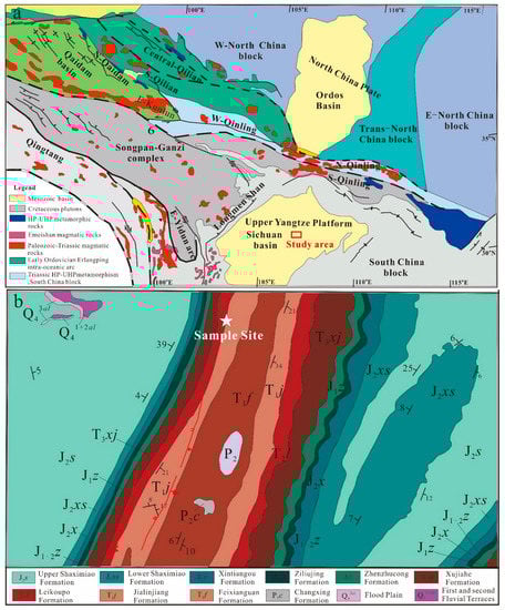 (a) Simplified regional map showing the locations and tectonics of the Sichuan Basin and its surrounding areas (modified from Enkelmann et al., 2007 [14]). (b) Simplified regional geological map showing the locations of Xiejiacao section in studied area [15].