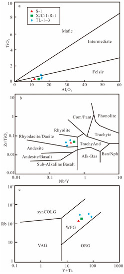 The major and trace element compositions of the clay sample (XJC-1-R-1) collected from the same outcrop of the Xiejiacao section and the clay sample (TL-1~3) collected from the Tongliang section in the neighboring area are also presented in Table 1 and Table 2 [2,3]. The REE data of the clay sample (XJC-1-R-1) and (TL-1~3) are also listed in Table 3 and chondrite-normalized REE distribution patterns are presented in Figure 4c. Overall, the major element composition of the bulk rock (S-1) is consistent with the data for the clay sample (XJC-1-R-1) published by Ju et al. (2019) [3], which was collected from the same outcrop in the Xiejiacao section. HFSE, (e.g., Nb, Ti, Zr, Y, Ta) and REEs are widely considered to preserve source characteristics as they usually remain immobile during secondary alteration processes [38,39]. Therefore, the HFSE contents of bulk rocks are widely used to reveal the parental magmas and tectonic settings of volcanic ashes. The HFSE (Nb, Ta, Hf, Zr), REEs, and TiO2 are considered important indicators for magmatic origin as they are immobile during diagenesis and weathering [40,41]. The Al2O3/TiO2 ratio is commonly used as reliable proxy indictor of the provenance, since the contents of Al and Ti remain constant in materials with different degrees of weathering [42,43]. According to the classification model (Al2O3 vs TiO2), the volcanic ashes corresponding to the Li-rich K-bentonite deposits of the Xiejiacao section (S-1 and XJC-1-R-1) and Tongliang section (TL-1~3) are classified as felsic magmas, with intermediate-acidic to acidic composition (Figure 5a). The Zr/TiO2 and Nb/Y ratios are a reliable indicator of alkalinity and differentiation [38,44]. The Li-rich clay samples of Xiejiacao section and Tongliang section plot in the fields of rhyodacitic/dacitic based on the Winchester and Floyd (1977) [44] classification model, suggesting that the Li-rich clays probably originate from rhyodacite/dacite (Figure 5b). Following the discrimination diagrams after Pearce et al. (1984) [45], the immobile trace element Rb versus Y + Ta show that the Li-rich clays of Xiejiacao section and the Tongliang section lie in the field of within-plate granite, indicating that the parent volcanic eruption were caused by the mid plate volcanoes in the oceanic plate or associated with a mantle plume hotspot (Figure 5c). Furthermore, magmas that formed by a large fraction of low-temperature melts of felsic continental crust tend to have lower Zr concentration [1,46]. In addition, magmas with moderate to extreme lithium enrichment are generally considered to have incorporated felsic continental crust [1].