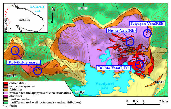 The geological setting and structure of the Vuoriyarvi alkaline-ultrabasic carbonatite complex simplified from [83]. Blue circles indicate the positions of the Tukhta-Vara, Neske-Vara, and Petyayan-Vara carbonatite fields and the Kolvikskiy agpaitic nepheline-syenite massif-satellite.