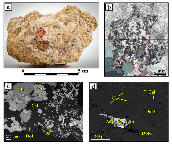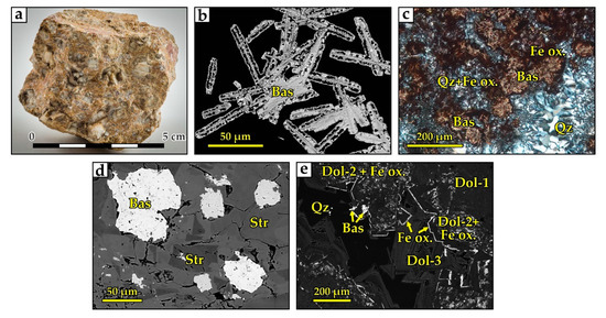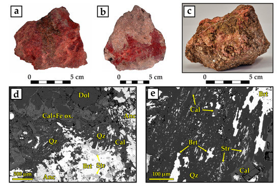 Ancylite assemblage. (a) Dissolution cavity in magnesiocarbonatite with minerals of the ancylite assemblage in place of primary dolomite. (b) Magnesiocarbonatite (grey) dissected by the vein with minerals of the ancylite assemblage (red). (c) Magnesiocarbonatite breccia with a matrix of minerals of the ancylite assemblage. (d) Dissolution cavity with intergrowths of strontianite, baryte, and ancylite in the late pore-filling quartz and calcite; dolomite in contact with the dissolution cavity is replaced by calcite with Fe-hydroxide inclusions. (e) Quartz-baryte-strontianite intergrowths. Photomicrographs (d,e) are BSE images.