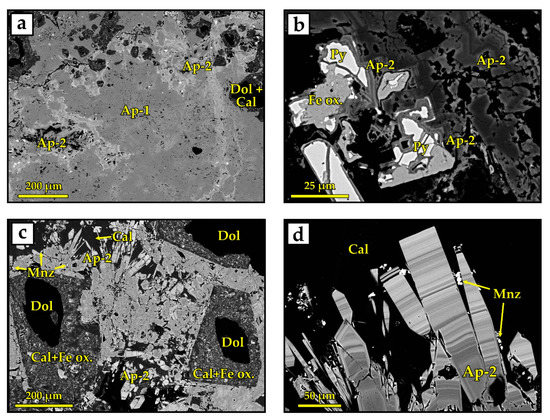 Calcite is associated with apatite in veins and pseudomorphically replaces dolomite near the late idiomorphic apatite crystals (see Figure 4c). In pseudomorphs, calcite commonly hosts inclusions of Fe-hydroxides.