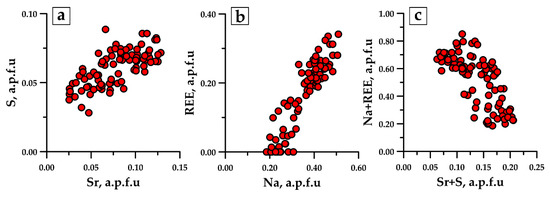In contrast, the composition of both the rims and idiomorphic crystals of late apatite Ap-2 is highly variable, even within a single grain. On the BSE images, this compositional variability is expressed as fine oscillatory zoning (Figure 6d). In Ap-2, SO3 content varies in the range of 0.4–1.3 wt. %, SrO concentration reaches 3.0 wt. %, Na2O reaches 3.0 wt. %, and ThO reaches 0.9 wt. %. Total REE2O3 content is 8.8 wt. %, with increased content of heavy REE (up to 0.6 wt. % Gd2O3 and 1.9 wt. % Y2O3). A positive correlation between Sr and S indicates the joint occurrence of these elements in the structure of Ap-2 (Figure 7a). A similar positive correlation is observed between Na and REE (Figure 7b). However, the correlation between the contents of (Sr + S) and (Na + REE) is inverse (Figure 7c). The zoning in Ap-2 can thus be explained by the successive alternation of apatite sites enriched with either Sr and S or Na and REE (the dark and light apatite zones in Figure 6d, respectively). Nevertheless, Sr and S mainly accumulated during the initial stage of Ap-2 growth, and Na and REE mostly accumulated during the later stage (see Figure 6d).