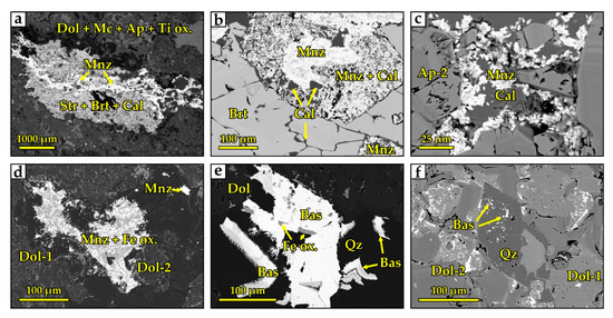 Secondary mineral assemblages of high-Ti carbonatites. (a) Baryte, ancylite, strontianite, calcite, quartz, and brookite surrounded by resorbed dolomite in a cavity. (b) Monazite formed near the late apatite. (c) A monazite vein that intersects a cavity with baryte–strontianite mineralization. (d) Partial replacement of dolomite with clusters of monazite and iron oxides. (e) Porous bastnäsite in association with collomorphic quartz cementing the latest cracks. (f) bastnäsite microinclusions in idiomorphic quartz crystal. All photomicrographs are BSE images.