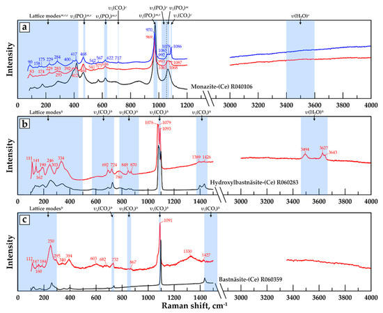 Raman spectra of (a) monazite-(Ce), (b) hydroxylbästnasite-(Ce), and (c) bästnasite-(Ce) from high-Ti carbonatites of the Petyayan-Vara (red and blue lines). Spectra (black lines) and ID references of minerals are from the RRUFF database [107]. The positions of the main bands (see Table 2) of monazite (m), rhabdophane (r), calcite (c), hydroxylbästnasite (h), and bästnasite (b) are plotted.