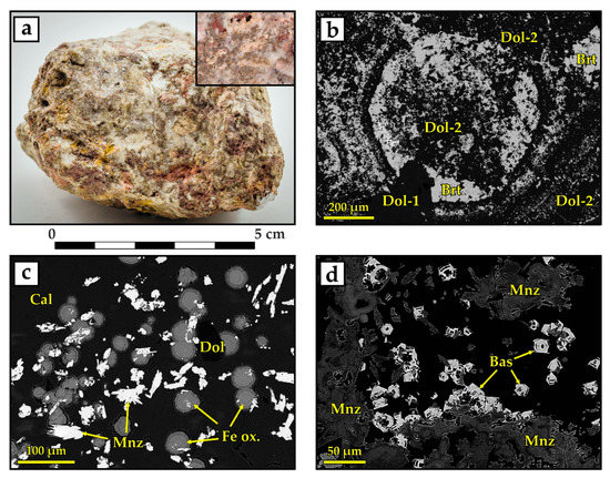Baryte assemblage. (a) Baryte-dominant magnesiocarbonatite, in the inset photo—a polished section with primary dolomite (light grey), dolomite–baryte dissolution cavities (brown), and late caverns filled with minerals of ancylite and strontianite assemblages (red and light pink). (b) Collomorphic texture composed of baryte and secondary dolomite Dol-2. (c) Collomorphic texture of iron oxides and hydroxides and sheaves of monazite crystals. (d) Euhedral bastnäsite crystals at the edges of a colloform monazite. Photomicrographs (b–d) are in the backscattered electrons (BSE).
