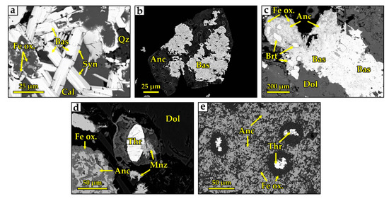 Accessory minerals of ancylite-bearing carbonatites. (a) Bastnäsite laths and tabular syntaxial intergrowths of bastnäsite (white) with synchysite (light gray) in late pore-filling quartz and calcite (dark gray). (b) Ancylite, pseudomorphically replaced by anhedral aggregates of bastnäsite. (c) The cavity, filled by fibroradial bastnäsite aggregates and grains of baryte, ancylite, and iron oxides. (d) Monazite in association with thorite. (e) HREE-rich thorite inside Fe-oxides. All photomicrographs are BSE images.