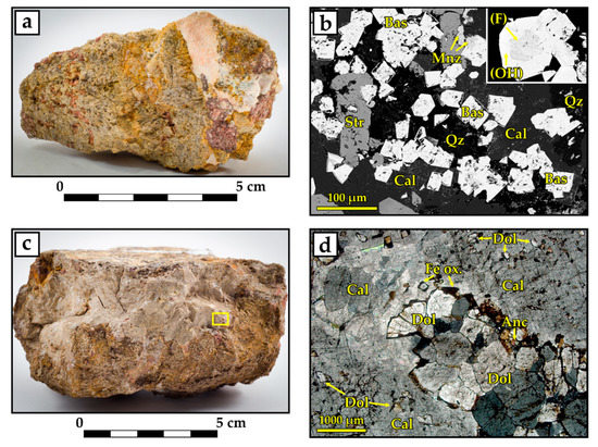 (a) Calcite–strontianite veinlets (pinkish-white), crossing the ancylite-bearing magnesiocarbonatite with pseudomorphs after burbankite (dark red segregations on the right side of the sample). (b) Polished section of the pseudomorph, composed of calcite, strontianite, baryte, monazite, quartz, and zoned bastnäsite; the inset shows a bastnäsite (F) core with a hydroxylbastnäsite (OH) rim. (c) A fragment of a gigantic-grained calcite vein from the margin of ancylite-bearing carbonatite. (d) Vein selvage (yellow rectangle in photo c) with fragments of the enclosing magnesiocarbonatites and separate dolomite inclusions in the gigantic-grained calcite. Photomicrographs (b) under backscattered electrons (BSE images) and (d) transmitted cross-polarized light.