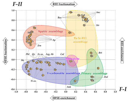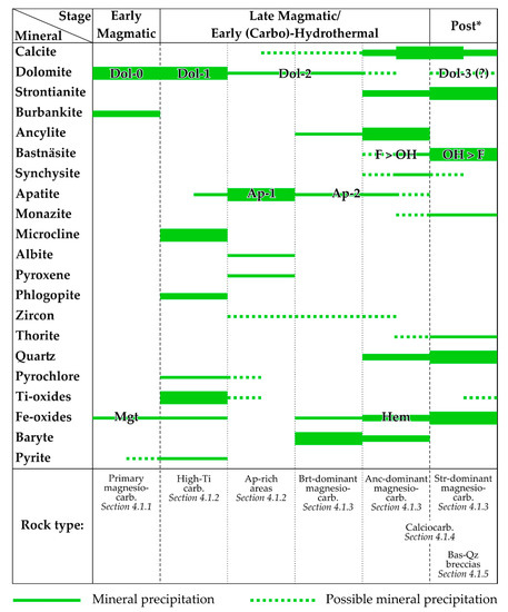 These observations combined with our data obtained for other carbonatite varieties of the Petyayan-Vara suggest a paragenetic sequence similar to that for the Bear Lodge carbonatites ([72]; cf. their Table 1 and our Figure 16) and others of the Kola Peninsula ([78] and references therein).