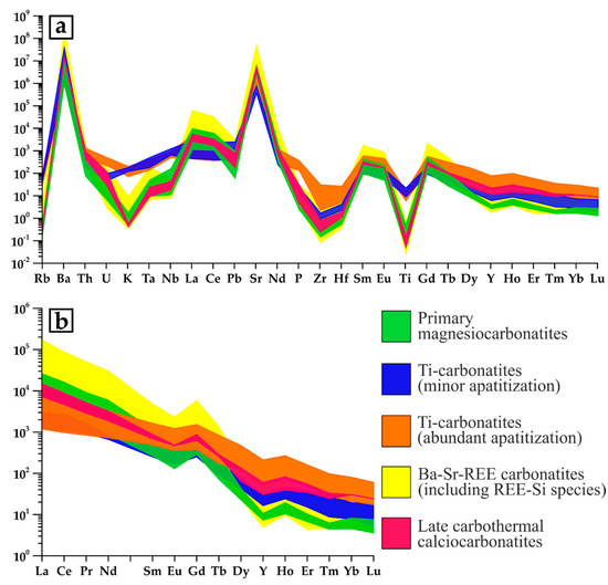 Samples in Figure 5 are grouped as follows: (1) rocks that contain pyrochlore mineralization and are free of Ti-oxides (with high Nb content and Nb/Ti ratio of 0.4–1.2); (2) high-Ti carbonatites and least altered magnesiocarbonatites hosting TiO2-carbonate veinlets (with high Nb content and a Nb/Ti ratio of 0.01–0.03); and (3) rocks free of both pyrochlore and Ti-oxides (with low Nb content and a variable Nb/Ti ratio). The high Nb contents in combination with the low Nb/Ti ratios suggest that Ti-oxides are the principal niobium concentrators in high-Ti carbonatites (as well as the Petyayan-Vara carbonatites in general), which is typical of the late-stage carbonatites of many other complexes worldwide (e.g., [91,92,93]).