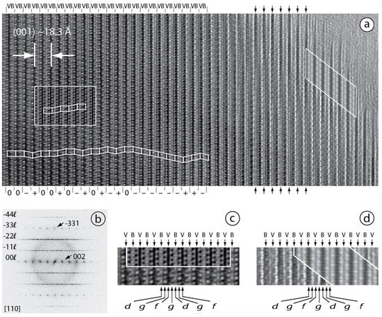 - Ferraris, G.; Gula, A.; Ivaldi, G.; Nespolo, M.; Sokolova, E.; Uvarova, Y.; Khomyakov, A.P. First structure determination of an MDO-2O mica polytype associated with a 1M polytype. Eur. J. Mineral. 2001, 13, 1013–1023. [Google Scholar] [CrossRef]
