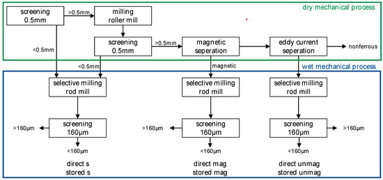 For the work presented in this paper, only the first two steps were carried out. The flowchart of these two steps is shown in Figure 1. The dry mechanical processing starts with a screening at 0.5 mm. The fine fraction (<0.5 mm) is directly processed in a wet mechanical process step. The coarse material (>0.5 mm) is milled with a roller mill. After that, a second screening at 0.5 mm is carried out. The coarse material is then processed by magnetic and eddy current separation to obtain a magnetic and non-magnetic fraction for further processing and a nonferrous product. The residuals are forwarded to the wet mechanical process [16,27].