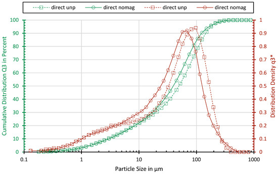 All the samples show similar particle size distributions. The particle size distributions of sample “direct unp” and sample “direct nomag” are shown exemplarily in Figure 2. Sample “direct nomag” comprises a slightly higher share of fine particle sizes due to the additional processing. The x90 values for the sample are 145 and 123 µm. With 22% and 30%, both samples have a high amount of fines below 10 µm.