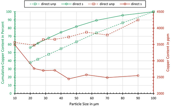 Figure 3 shows the concentration and cumulative content of copper, dependent on the particle size. While, in the classes above 20 µm, no significant relationship can be observed, the processed samples show a slight enrichment of 2 in the fraction below 20 µm. Probably, Cu is oxidized to a brittle mineral form such as copper oxide so that the selective crushing does not lead to deformation but the crushing of the copper. From the copper contained in the fraction below 100 µm, about 40% of the processed sample and nearly 60% of the processed sample lie below 20 µm.
