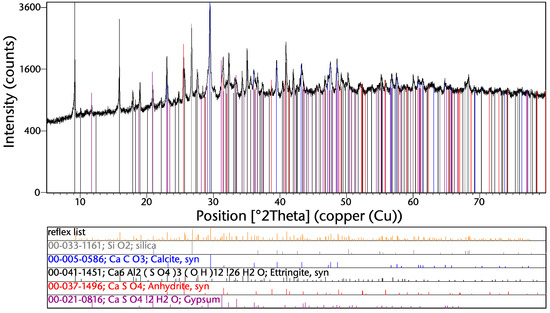 The formation of ettringite takes place during the hydration of cement. This, together with the presence of silica, calcite, anhydrite, and gypsum, leads to the assumption that at least a large share of this phase originates from used construction materials. Another main compound might also be glass, which cannot detected by the XRD due to its amorphous structure.