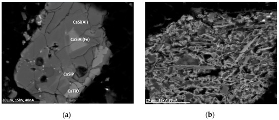The main compound of the matrix is silicate glass, partly with a stoichiometric composition. The main essential elements are Al, Si, Mg, Ca, and Fe. The chemistry of this glass is highly variable (Figure 9) and can include noticeable concentrations of P. Additionally, some glass particles can contain S and Cl, as well as Ti and Mn. Furthermore, but rather infrequently, the concentration of Cu and Zn is elevated.