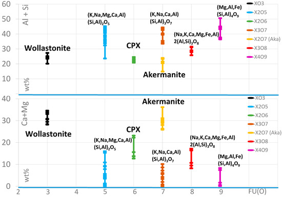 Element distribution of the selected main elements in different glass and silicates, listed concerning the oxygen formula units (FU(O)). CPX: clinopyroxene.