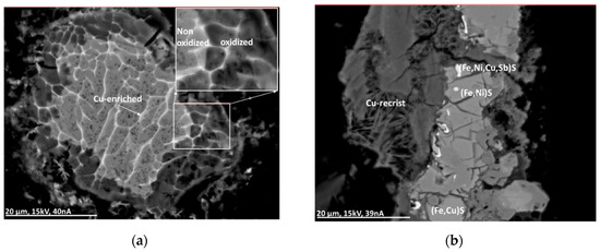 The only valuable metal to be frequently higher concentrated in the analyzed particles is Cu. The highest concentrations of this metal can be found in sulfides and oxides (Table 4, see corresponding Section 3.4.3 and Section 3.4.4). However, the sulfides can be masked by an oxide layer (Figure 7).