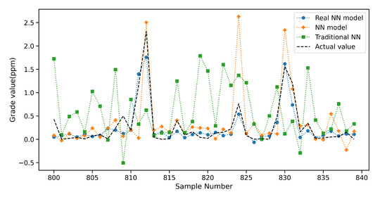 | Sample ID | Actual Grade (ppm) | Real NN Model | NN Model | Traditional NN | |||